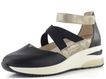 Pohodlné letní polobotky od značky Remonte by Rieker kombinují sportovně-elegantní styl s praktičností, kterou oceníte při každodenním nošení. Jejich užší kulatá špička s elegantním prostřihem do "V" a křížené gumičky na nártu zajišťují perfektní přizpůsobení. Svršek z hladké povrstvené kůže v černé barvě s jemnými béžovými metalickými detaily dodává botám šmrnc. Kotníkový pásek na suchý zip a všitá pruženka zaručují snadné obouvání a maximální komfort. Extra měkká vyjímatelná stélka z paměťové pěny s podporou podélné nožní klenby je ideální pro celodenní nošení. Lehká syntetická podešev s malým klínkem dodává stabilitu a styl.