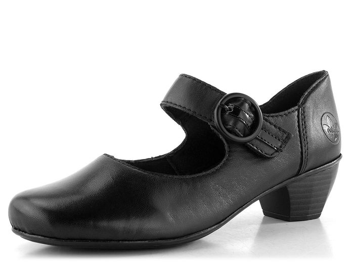 Dámské lodičky Rieker s nártovým páskem v elegantní černé barvě jsou ideální volbou pro každodenní nošení. Tyto komfortní boty s kulatým střihem špičky se vyznačují svrchním materiálem z hladké kůže a syntetickou patou, což zaručuje jak styl, tak i pohodlí. Nártový pásek se zapíná na suchý zip, což usnadňuje obouvání, zatímco dekorativní spona dodává na atraktivitě.