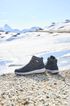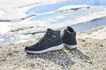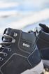 Kožený pánský kotník v tmavé šedomodré barvě a širším střihu, s teplou vlněnou podšívkou a funkční membránou.