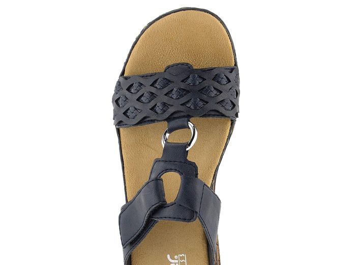 Dámské tmavě modré pantofle s nártovým upínacím páskem a na vyšší platformě s klínkem.