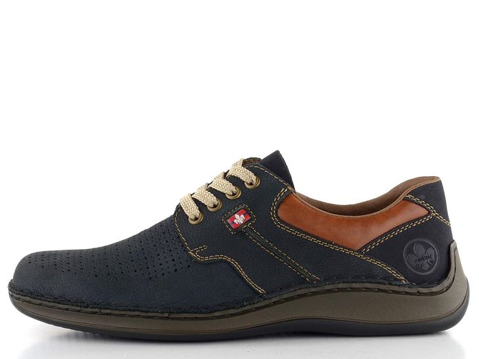 Širší pánské polobotky značky Rieker jsou ideální volbou pro jarní a letní sezónu. Tyto polobotky se vyznačují hranatějším tvarem špičky, který je výrobcem deklarován jako Extra Weit, což zajišťuje pohodlí pro širší typ chodidel. Svršek je vyroben z kvalitní nubukové kůže a syntetiky, přičemž špička má perforovaný vzor, který není z rubové strany podšitý, což přispívá k lepší prodyšnosti. Boty mají tmavě modrou barvu s béžovými a koňakovými prvky, což jim dodává stylový vzhled. Podšívka kombinuje netkanou textilii a hladkou syntetiku, zatímco měkká stélka potažená kůží poskytuje maximální komfort. Shora šitý svršek na syntetickou podešev zajišťuje výjimečnou flexibilitu těchto polobotek.