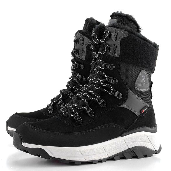 Teplé, komfortní a skvěle vybavené dámské kotníkové boty od značky Rieker Revolution. Tato obuv z nové produktové řady R-EVOLUTION je lehká, neuvěřitelně měkká, pružná a pohodlná. Svršek tvoří kombinace semišové kůže a textilie, špička je chráněna syntetikou. Černá barva se šedými doplňky dodává botám elegantní vzhled.