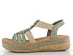 Objevte eleganci a pohodlí s dámskými módními sandály značky Rieker v šalvějově zelené barvě. Tyto sandály jsou ideální volbou pro jarní a letní dny. Díky pruženkám na obou stranách je obutí snadné a rychlé, zatímco pásky vyrobené z matné syntetiky a zdobené bižuterními korálky dodávají sandálům jedinečný vzhled. Pevná syntetická podešev na mírném klínku s proužkem z přírodní juty zajišťuje stabilitu a komfort při každém kroku. Vnitřní strana pásků je z hladké syntetiky a příjemně měkká stélka potažená broušenou textilií poskytuje maximální pohodlí. S výškou podpatku 4,5 cm jsou tyto sandály nejen stylové, ale i pohodlné pro celodenní nošení.