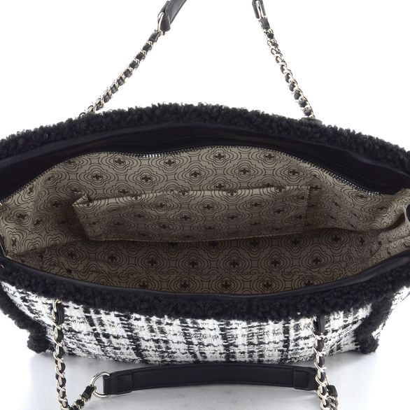 Dámská prostorná shopper kabelka se tkaným vzorem a beránkovými lemy v černo-bílém provedení.