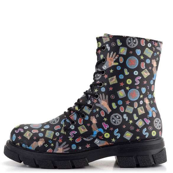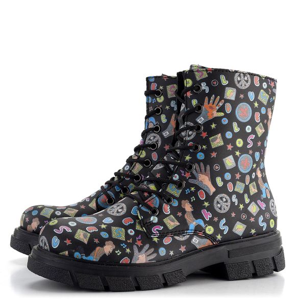 Dámský mírně vyteplený šněrovací kotník v černé barvě s barevným potiskem a traktorovou podešví.