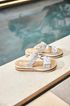 Dámské šedo-stříbrné pantofle s upínacími pásky a na vyšší platformě s klínkem.
