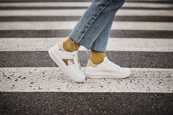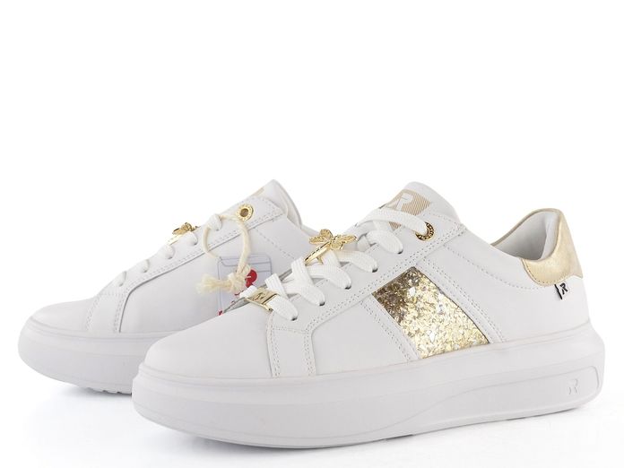 Představujeme vám stylové dámské tenisky od značky Rieker, které kombinují pohodlí a moderní design. Tyto uzavřené boty z kolekce Sport&Style jsou ideální pro jarní a letní sezónu. Svršek z hladké povrstvené kůže v bílé barvě s jemnými metalickými detaily dodává teniskám šmrnc. Klasické šněrování je obohaceno o kovovou brož ve tvaru vážky, kterou lze snadno sundat. Extra polstrovaný kotníkový lem zajišťuje maximální pohodlí, zatímco měkká vyjímatelná stélka s podporou nožní klenby a perforací v přední části je ideální pro celodenní nošení. Lehká vysoká platforma o výšce 4,5 cm dodává botám moderní vzhled a zajišťuje pohodlí při každém kroku.