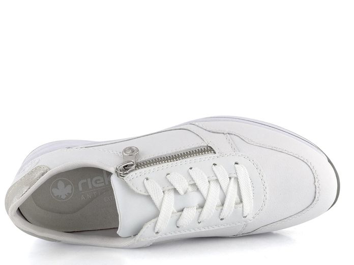 Dámské tenisky značky Rieker N9501-80 spojují styl a pohodlí v jednom. Tyto trendy boty v čisté bílé barvě jsou ideální volbou pro každodenní nošení, ať už vyrazíte do města nebo na lehkou procházku. Svršek z jemně strukturované kůže a syntetické detaily zajišťují nejen skvělý vzhled, ale i dlouhou životnost.