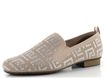 Dámské textilní mokasíny se vzorem ze třpytivých kamínků a nízkým širokým podpatkem.