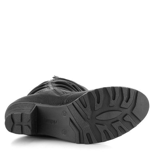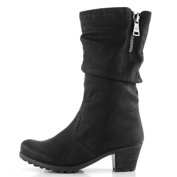Elegantní dámské polokozačky od značky Rieker jsou ideální volbou pro podzim a zimu. Tyto boty vynikají prostorným oblým střihem špičky a syntetickým materiálem se strukturou kůže v černé barvě. Stylové módní řasení dodává botám jedinečný vzhled. Na vnější straně je umístěn zip s pružinovou vsadkou, která umožňuje rozšíření obvodu o 2-3 cm, což zajišťuje pohodlné nošení. Klasické obutí na postranní zip usnadňuje každodenní používání. Vnitřní část boty je vybavena velmi teplou podšívkou z umělého beránku a stélkou potaženou filcovou textilií, což zaručuje maximální komfort i v chladných dnech. Latexová podešev s hrubým vzorkem poskytuje stabilitu a bezpečnost při chůzi. Výška polokozačky je 27 cm (bez podpatku) a výška podpatku činí 5,5 cm. Tyto boty jsou lepené výrobním způsobem, což zajišťuje jejich trvanlivost a kvalitu.